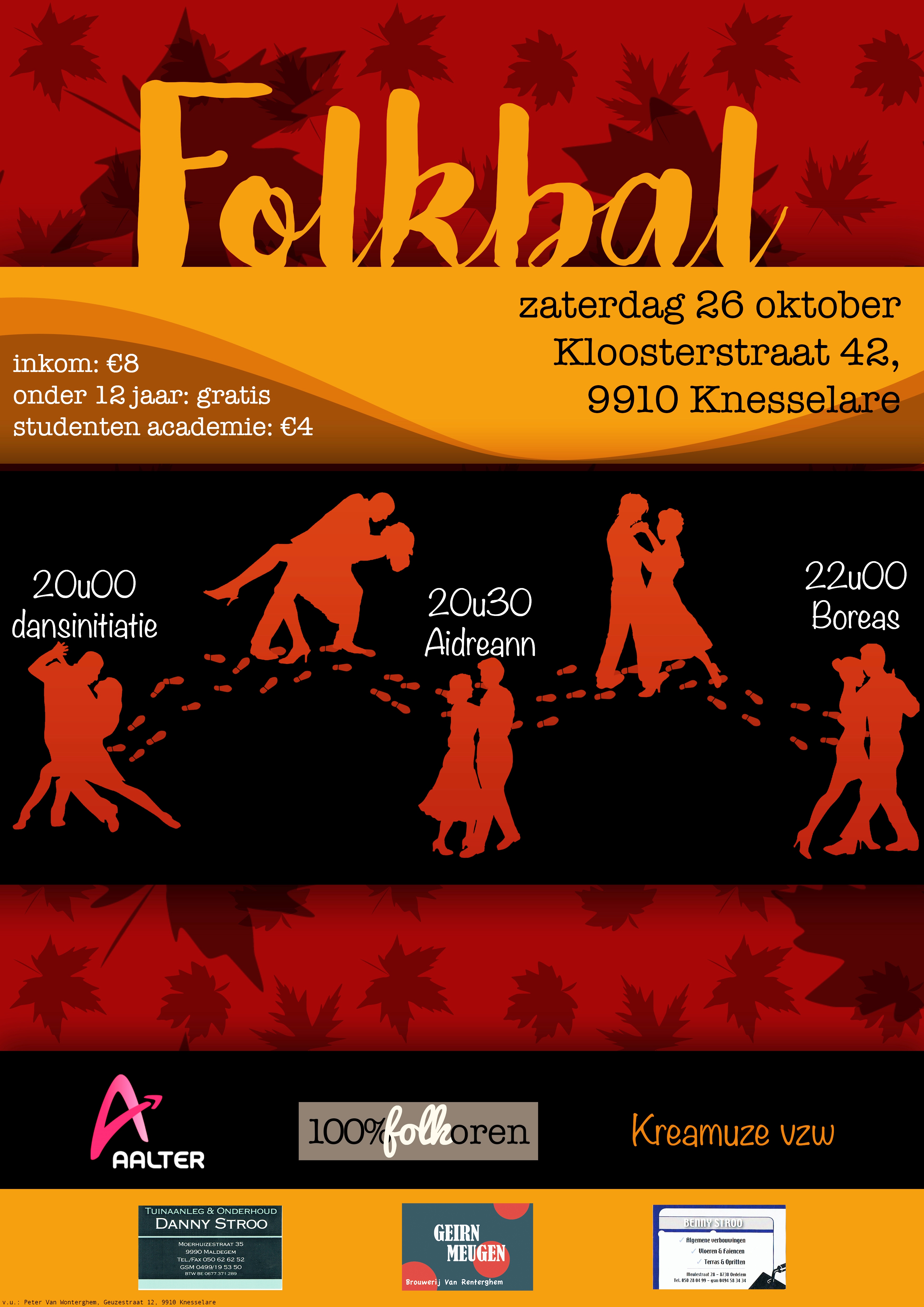 Met ons warm hart voor muziek kondigen we graag het Folkbal aan van zaterdag 26 oktober. Het heeft plaats in de gemeentelijke feestzaal in de Kloosterstraat. Zoals gebruikelijk start de avond met een dansinitiatie. Op het podium de groep Aidreann (20.30 uur) en de groep Boreas (22 uur).