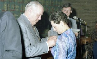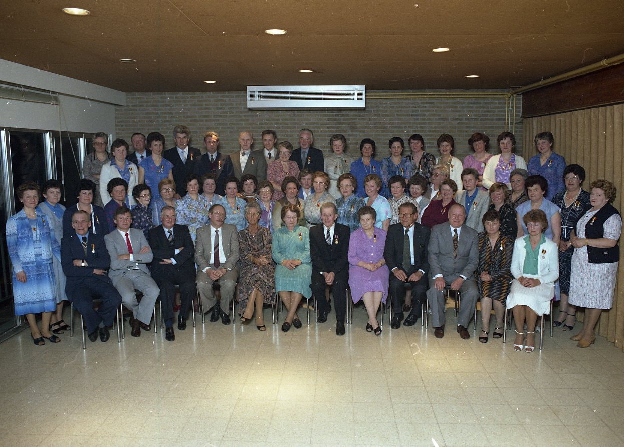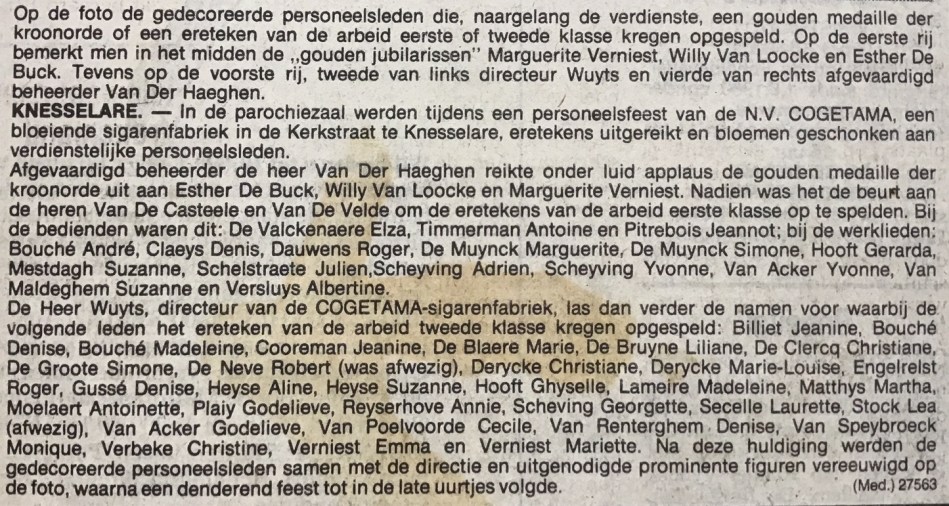 Tijdens een van de laatste personeelsfeesten van Cogetama werden eretekens en bloemen uitgereikt aan de personeelsleden met voldoende jaren op de teller. Onder de foto het krantenknipsel met verslag en namen. Niet zoveel later eindigt het verhaal van Cogetama. (meer teksten en foto’s Cogetama? Gebruik zoekrobot rechts naast of op mobiel toestel onderaan de tekst en tik er Cogetama)