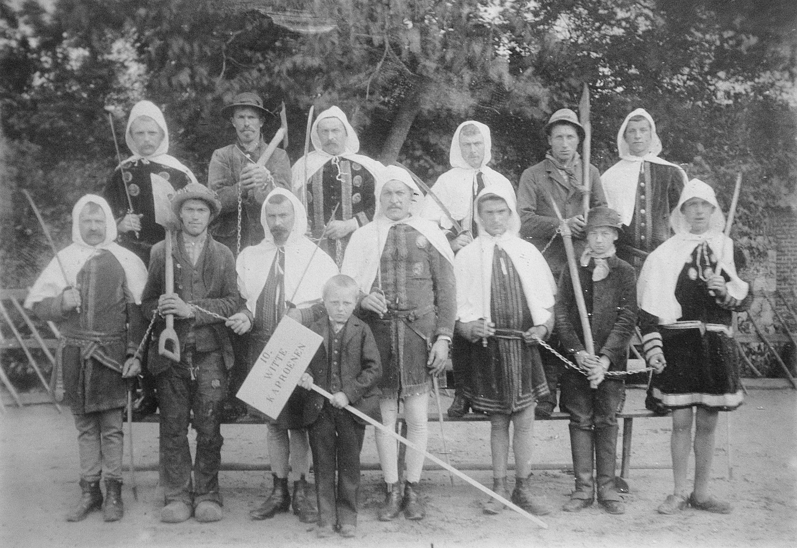 De Witte Kaproenen aangevoerd door Jan Hyoens, in een stoet omstreeks 1960, ter hoogte van de Bethunestraat. Stoere voorman is (o.v.) Marcel D’Hondt.