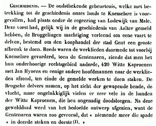 In hun historisch werk over de gemeenten van Oost-Vlaanderen verwijzen de auteurs De Potter en Brouckaert in hun hoofdstuk over onze gemeente (1868-1870) naar de gevechten met de Witte Kaproenen in Knesselare en Aalter. Als bron vermelden ze Nicolas Despars (1522-1597), Chronijke van Vlaenderen, II, 499. Hieronder een kopie van hun tekst..