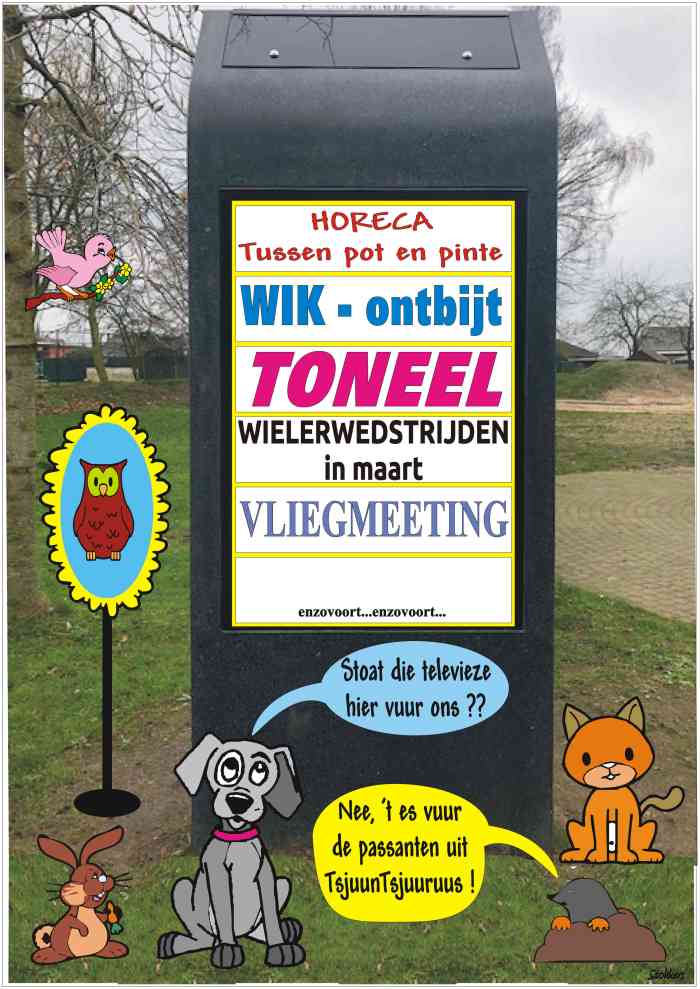 “Na het verschijnen van een krantenartikel in verband met de nieuwe “publieke infozuilen” heeft José Spriet gereageerd bij schepen Kristof De Blaere. Het verdwijnen van de bestaande borden zou volgens hem het einde zijn van de VERZORGDE reclame die de Feestraad maakte en waarmee ook doorrijdende passanten van buiten de gemeente op de hoogte werden gehouden. “Ik ben er vast van overtuigd dat behalve de organisatoren zelf ook de plaatselijke zelfstandigen o.a cafés, voedingszaken en andere hier nadeel van zullen ondervinden”, aldus nog Spriet, die meegeeft dat de borden verdwenen zonder dat de Feestraad werd ingelicht.