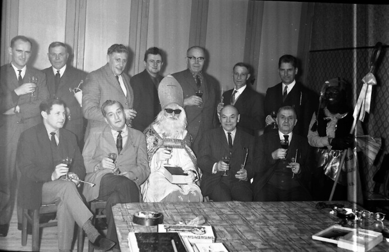 De Sint maakte niet zelden ook een ommetje naar plaatsen waar er al snel een borrel of ander drankje werd voorgeschoven. Burgemeester Maurits Devreese heft het glas met de gezonnebrilde Sint, omringd door gemeentebestuurders (1968)