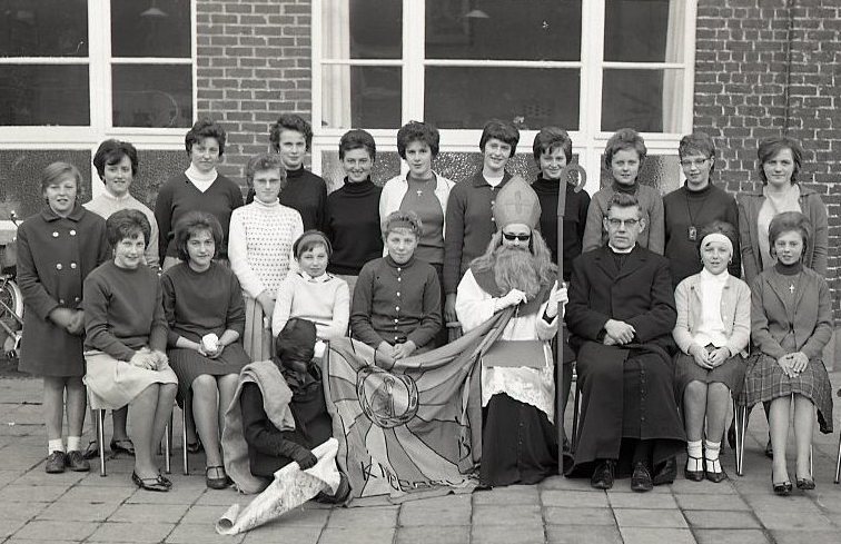 In het begin waren er nogal wat varianten op de vormgeving van Klaas en knecht. Een beeld van een vrouwelijke Sint (Suzanne Verkimpe) en haar helpster Elza Verheye. De kinderen zijn Fons, Godelieve en Cecile Hooft (1934, Foto Hooft)