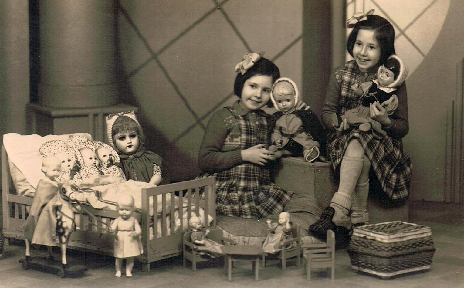 De Hongaarse meisjes Yolan en Margit poseren tussen speelgoed. Wellicht het oudste Knesselaarse portret met een Sinterklaastafereel. De meisjes werden opgevangen bij de fotograaf Alfons Hooft senior (jaren 1920)
