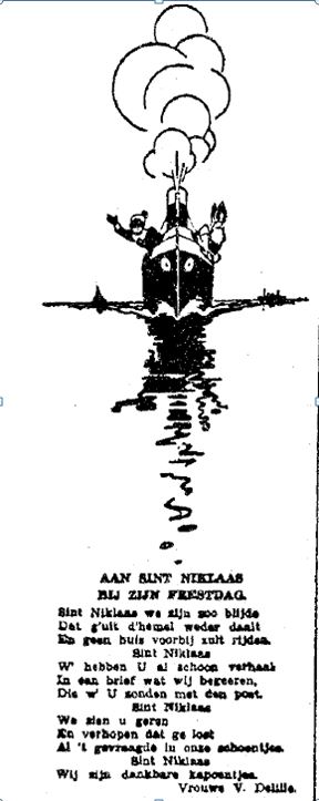 En hoe zat het in oorlogstijd (14-18)? Dan vinden we de Sint hier en daar vermeld in de berichtgeving over hulp van overzee. Er wordt bericht over “het Sinterklaasschip met Kerstgeschenken van de Amerikaansche kinderen voor de kinderen van soldaten en zeelieden in Europa die in den oorlog zijn of waren”…