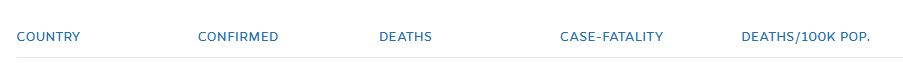 Zwarte kant van de wereldtabel van doden per duizend inwoners (Johns Hopkins, VS), zie vooral doden in aantallen (tweede kolom) en doden per 100.000 inwoners (rechterkolom)