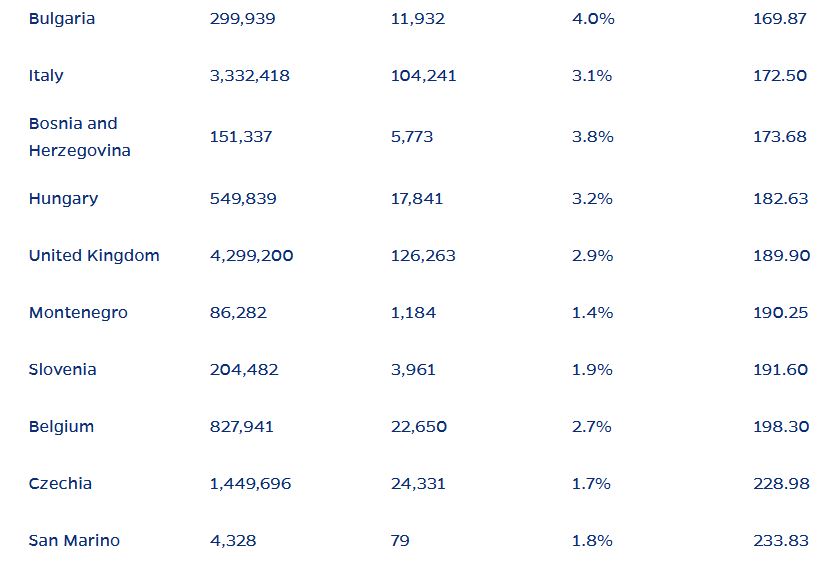 Dankzij San Marino, een landje van 30.000 inwoners, ergens verstopt in Italië, verhuisden we in de overlijdenstabel enkele weken geleden naar plaats twee. Die sleuf grond overtrof nog de Belgische cijfers. Sinds kort is ook Tsjechië ons langs de trieste kant gepasseerd….