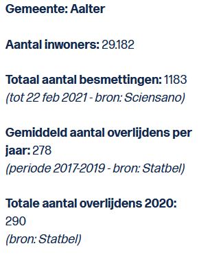 Die cijfers bestaan, maar worden maar vrijgegeven per provincie en per regio. En als er in België 22.650 geregistreerde overlijdens zijn sinds de “inval” van corona, dan zouden er dat verhoudingsgewijs in Aalter geen 10, maar 50-60 zijn. Goeie cijfers die toch om enige verduidelijking vragen?