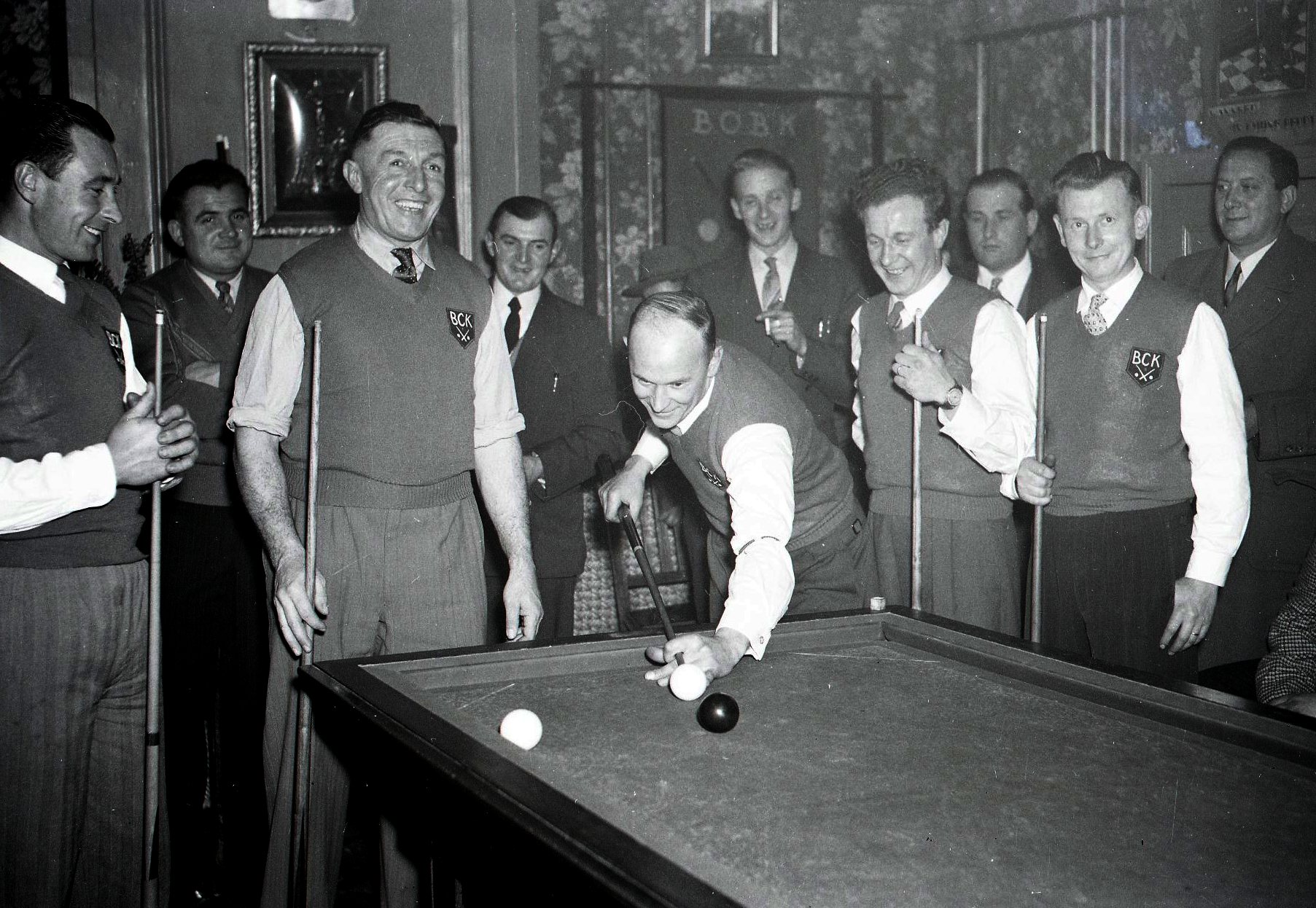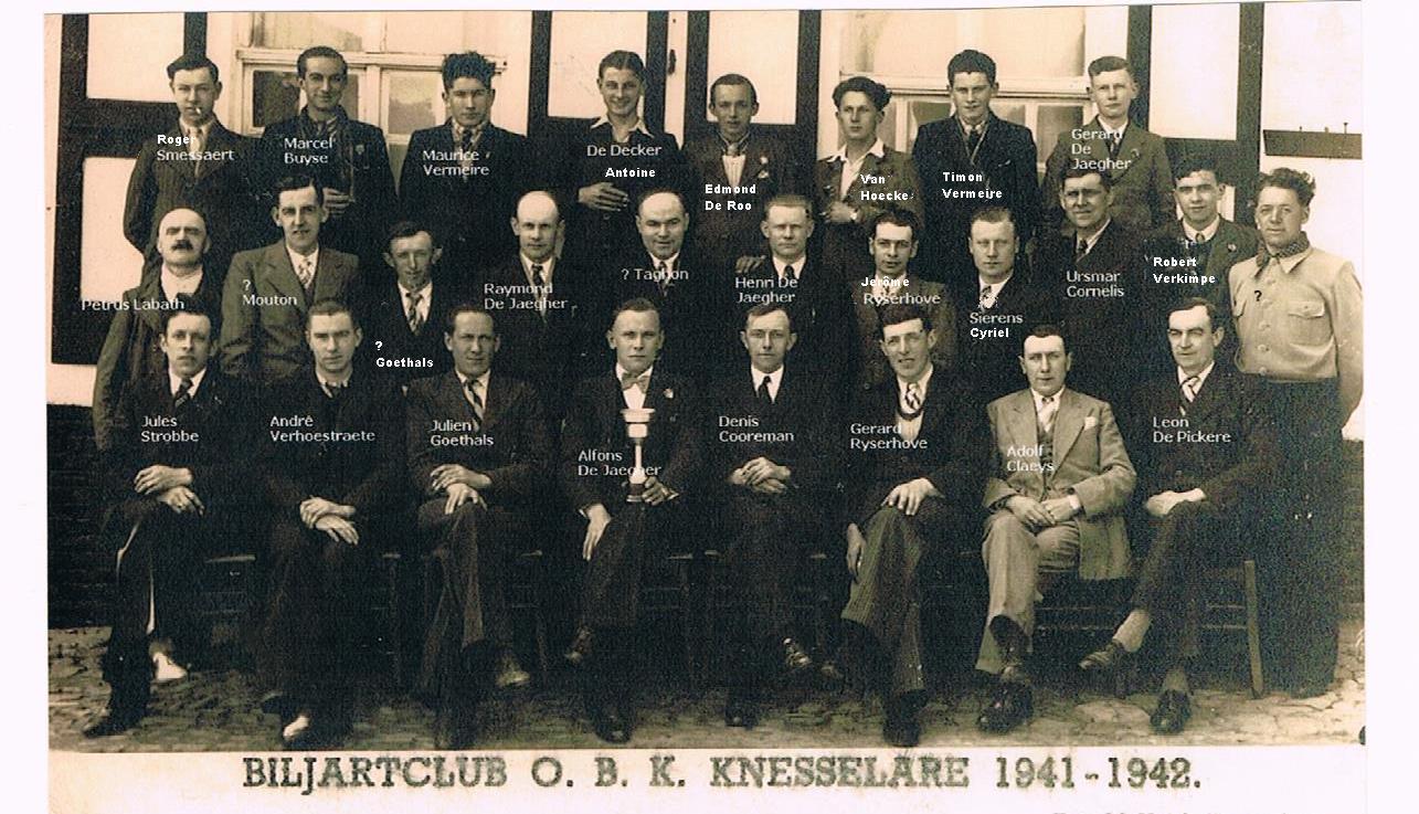 De biljartclub Oefening Baart Kunst (zie logo op vestjes) in het biljartlokaal bij Verplaetse op het Dorp. Vlnr: Verplaetse, naast hem Alfons De Jaegher, de beste biljarter ooit in Knesselare (Smissestraat), Romain De Neve (aan het biljarten, zoon van Maurice De Neve, muzikant-speelman die ook een café had in de Kerkstraat), Aimé Magerman (cafébaas in ’t Biljartlokaal, en Gerard De Jaegher (broer van Alfons, ook Smissestraatje). Nog op de foto: Roger De Decker (Grote Kapelle).