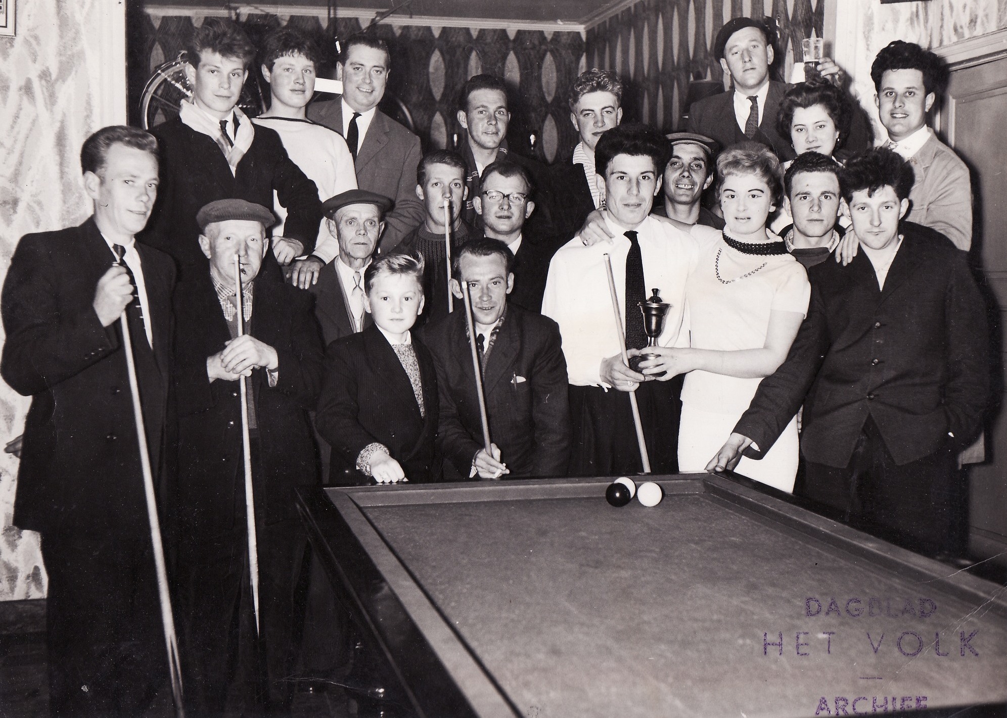 Zeldzame foto uit het lokaal ‘Krijt op Tijd’, bij Gentiel Verdonck in de Veldstraat. Huldiging van de kampioen Michel Dobbelaere, die won voor Antoine Timmerman en Antoon Scheyving. Foto 1959