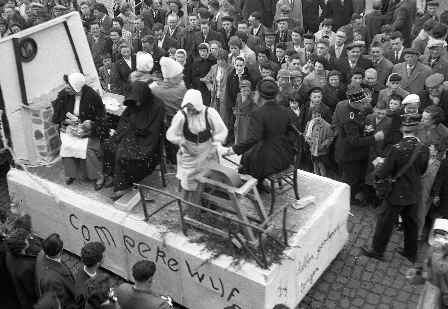 Een groep “comeerewijven” in de Knesselaarse carnavalstoet van 1960Over “écht Knesseloars” mogen we niet spreken, want de dialectgrenzen zijn complex, meer we vroegen destijds aan twee Knesselaarse verzamelaars (Paul Verhoestraete en Renaat De Blaere) om een lijst van 800 woorden te reduceren naar 300 woorden. Die legden we dan voor aan een Knesselaarse jury van nog eens acht dorpsgenoten (Harry Arnaut, Arseen Busschaert, Jean De Neve, Johan Gussé, Hugo Gyselbrecht, Caroline Mortier, Steven Schelstraete en Gerard Van de Casteele) om nog eens een selectie te maken.(*)