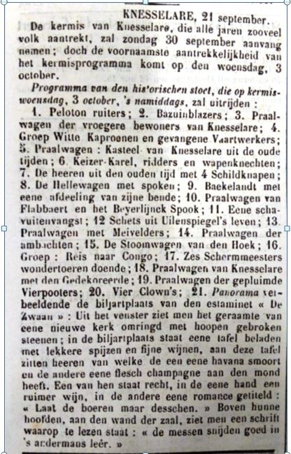 De regionale bladen geven een verslagje van de historische stoet op woensdag 3 oktober 1888. Hieronder een voorbeeld daarvan via knipsels uit het Fondsenblad en De Gazette van Eecloo. Interessant is vooral de oplijsting van het programma van de stoet, met verwijzing naar historische gegevens: de Witte Kaproenen en de vaartwerkers, het kasteel van Knesselare, de Hellewagen, Baekelandt, Flabbaert, het Beyerlink- of Ierlinkspook, Uilenspiegel, Congo, biljart in De Swaene, en wat andere ludieke groepen.