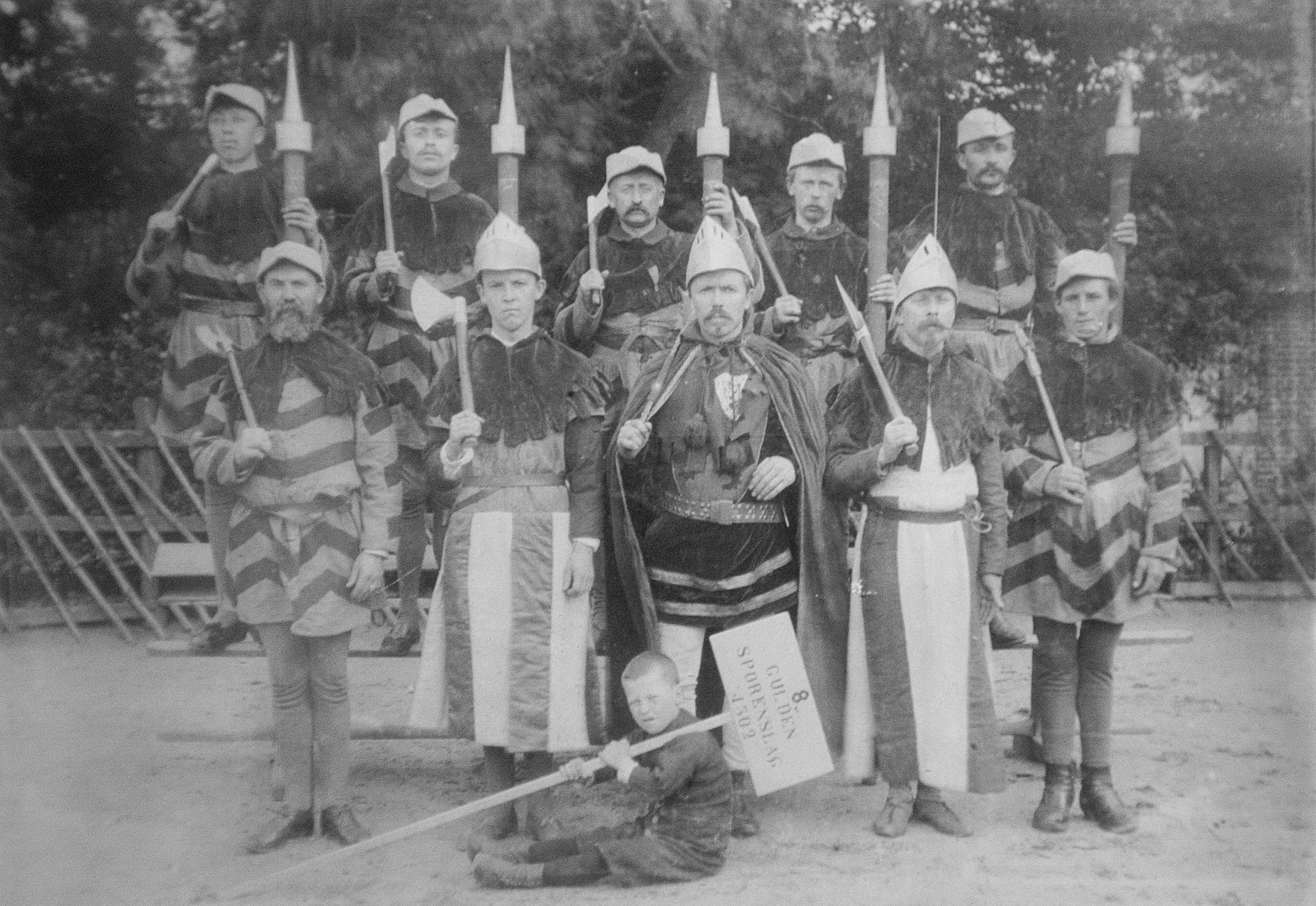 De stoet bracht het verleden in herinnering. Een groep figuranten klaar voor de Guldensporenslag (1302), de meesten met een echte goedendag in de hand