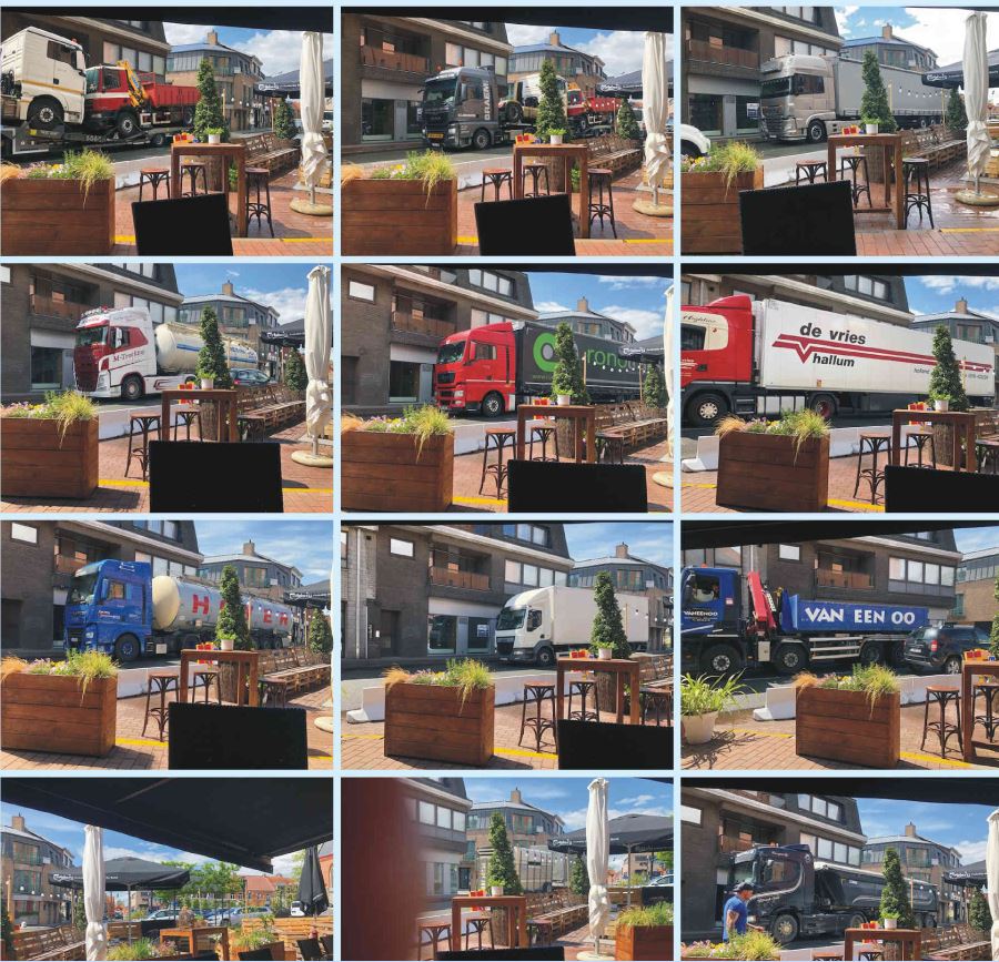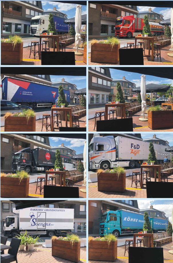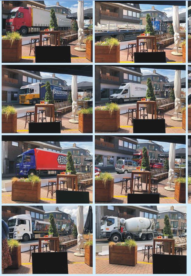 Het probleem van de verkeersdrukte wordt het duidelijkst op De Plaats en in de Veldstraat en de Urselseweg. Het is essentiëler, zeker als het samenvalt met dat van de verkeersinfrastructuur. Dat blijkt uit een kleine “cameracontrole”. Op woensdag 12 mei werden vanop een zeldzaam zonnig terras op het Dorpsplein op een uur tijd (van 13.01 uur tot 14.09 uur) niet minder dan 37 voorbij rijdende vrachtwagens geteld, naast 120 personenwagens en 9 grote tractoren (info Johan Gussé). Hieronder het uur samengevat in een viertal mozaïekjes.