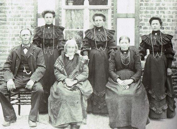 Rosalie, hier nog op haar 90ste, omringd door drie dochters, zoon en schoondochter. Let op de specifieke haartooi, lange kledij en siersels van de vrouwen rond 1900