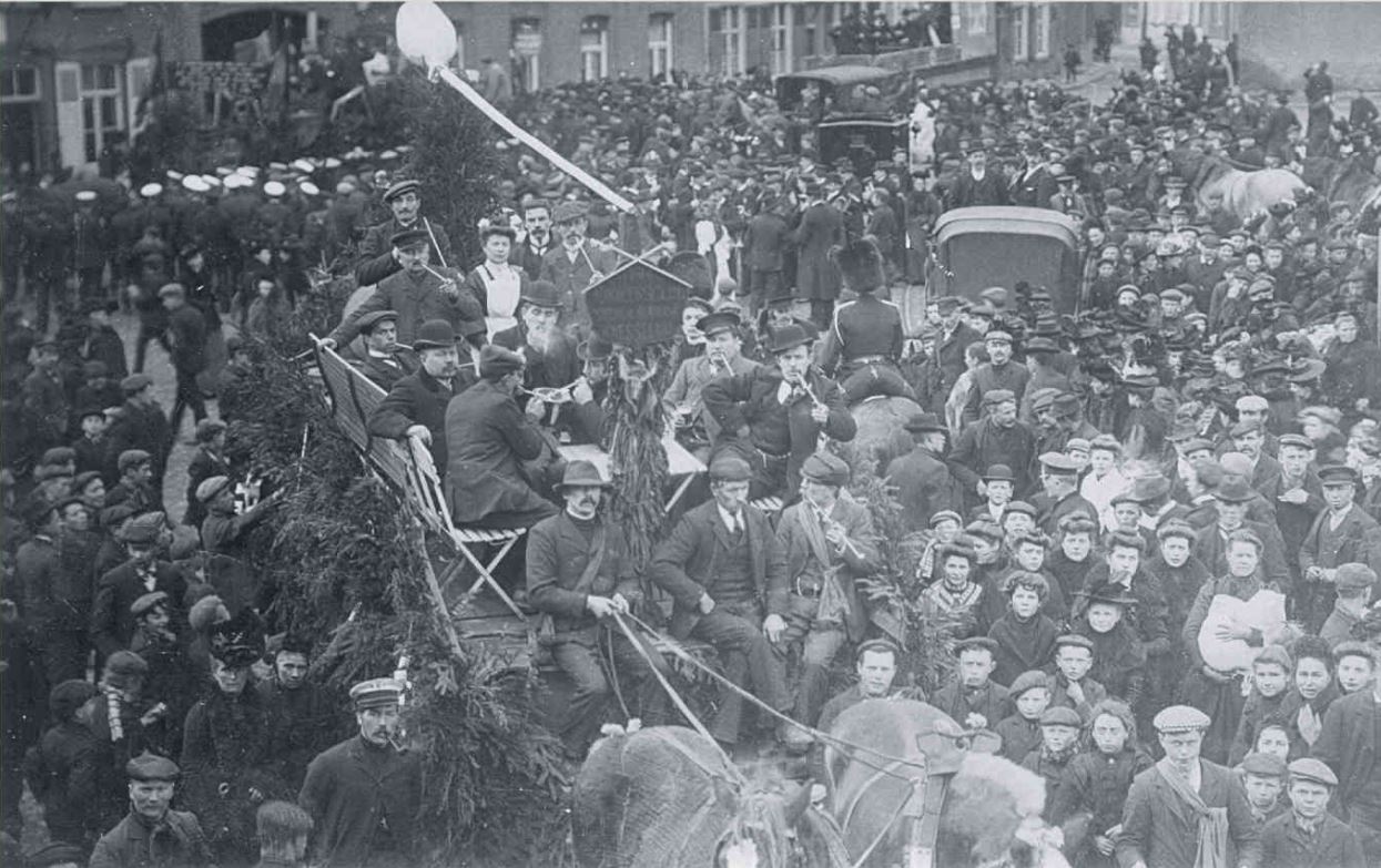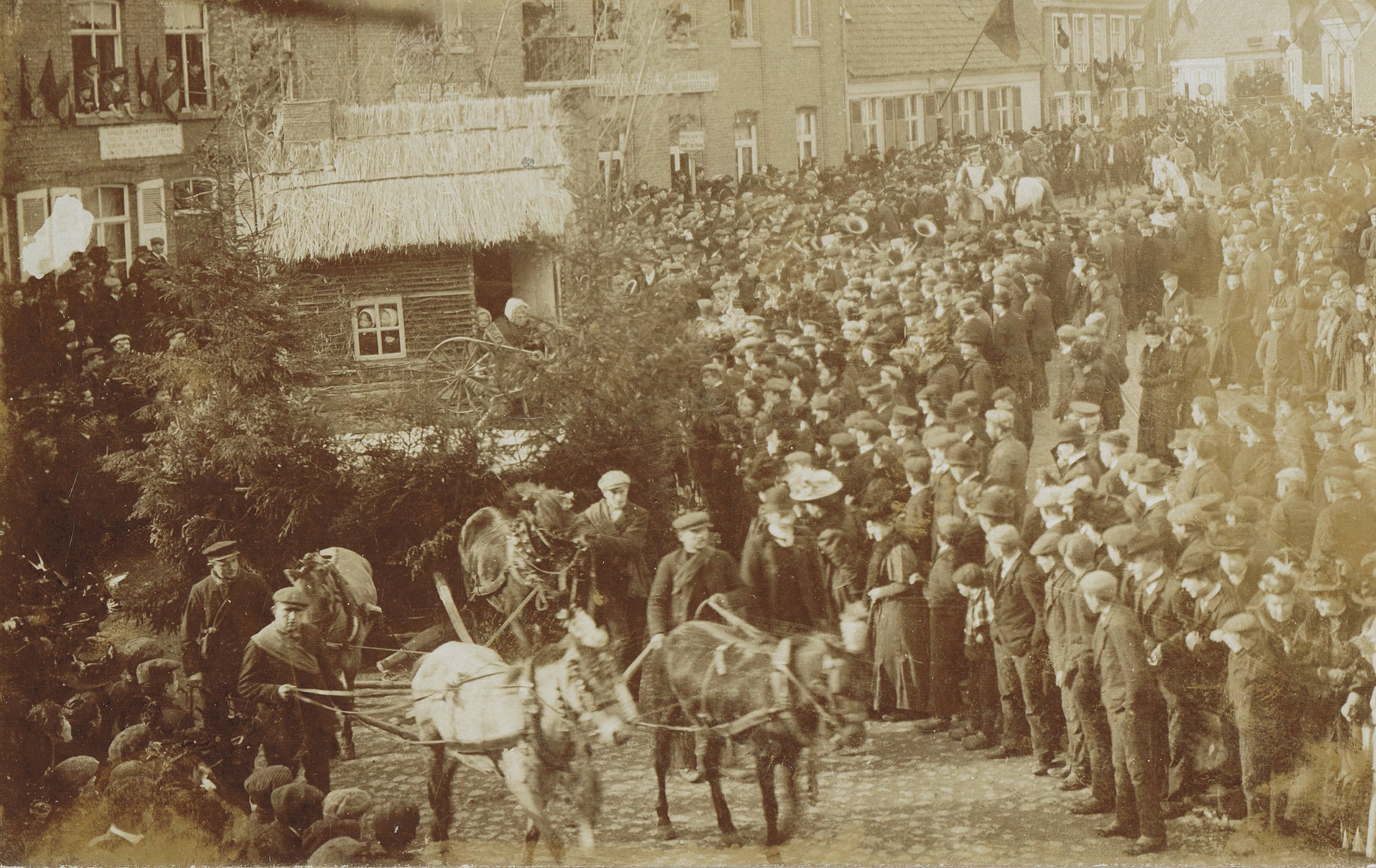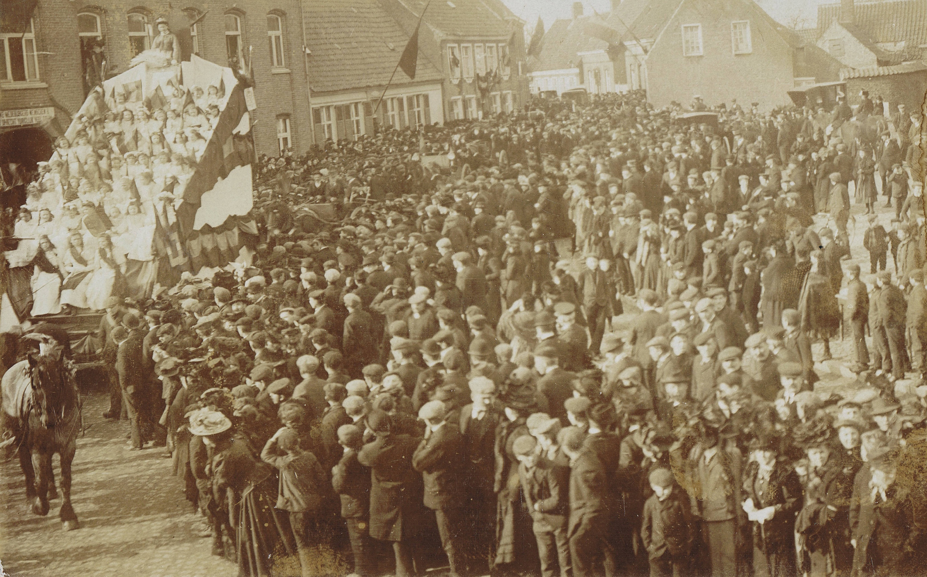 Imposante foto van de eeuwfeeststoet, met vooraan in beeld de Knesselaarse “rookersmaatschappij”. Mooi beeld ook van de kledij en kapsels van mannen en vrouwen in het begin van de jaren 1900