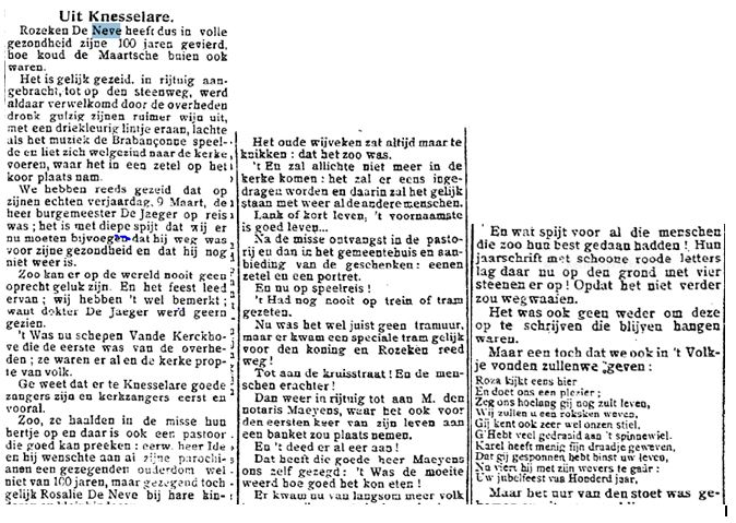 Rosalie werd geboren in Knesselare op 9 maart 1809, toen onze gewesten nog vanuit Parijs werden bestuurd. Vijf van haar zes kinderen stierven in de jaren 1860 van de “kropziekte”. Het eeuwfeest van Rosalie mocht er anders wel zijn. “Van ’s morgens vroeg indrukwekkend kanongeschut en klokkengelui. Rosalie wordt in een rijtuig aangebracht, drinkt gulzig een ruimer wijn, lacht als het muziek de Brabançonne speelt, laat zich welgezind naar de kerk voeren, die ‘propte van het volk’.” Het feest voor Rosalie was een van de grootste ooit in Knesselare georganiseerd. Meer details in het uitgebreide knipsel verderop. Voorop enkele sprekende foto’s, genomen door Alfons Hooft senior, vanuit zijn woning op De Plaats.
