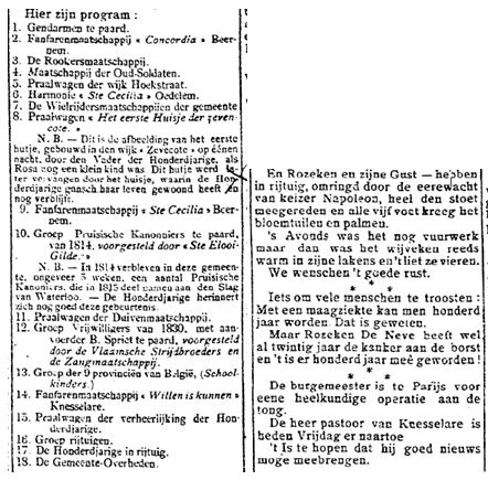 Het wordt een feest met kanonnengeschut en klokkengelui, gendarmen, fanfares, de Rookersmaatschappij, de Oud-Soldaten, praalwagens van de Hoekstraat, van de Duivenmaatschappij en de Wielrijdersmaatschappij. De Sint-Elooisgilde speelde een groep Pruisische kanonniers (een verwijzing naar de slag van Waterloo, toen Pruisen ook in Knesselare waren). De Strijdbroeders droegen dan weer de uniformen van “de vrijwilligers van 1830”…