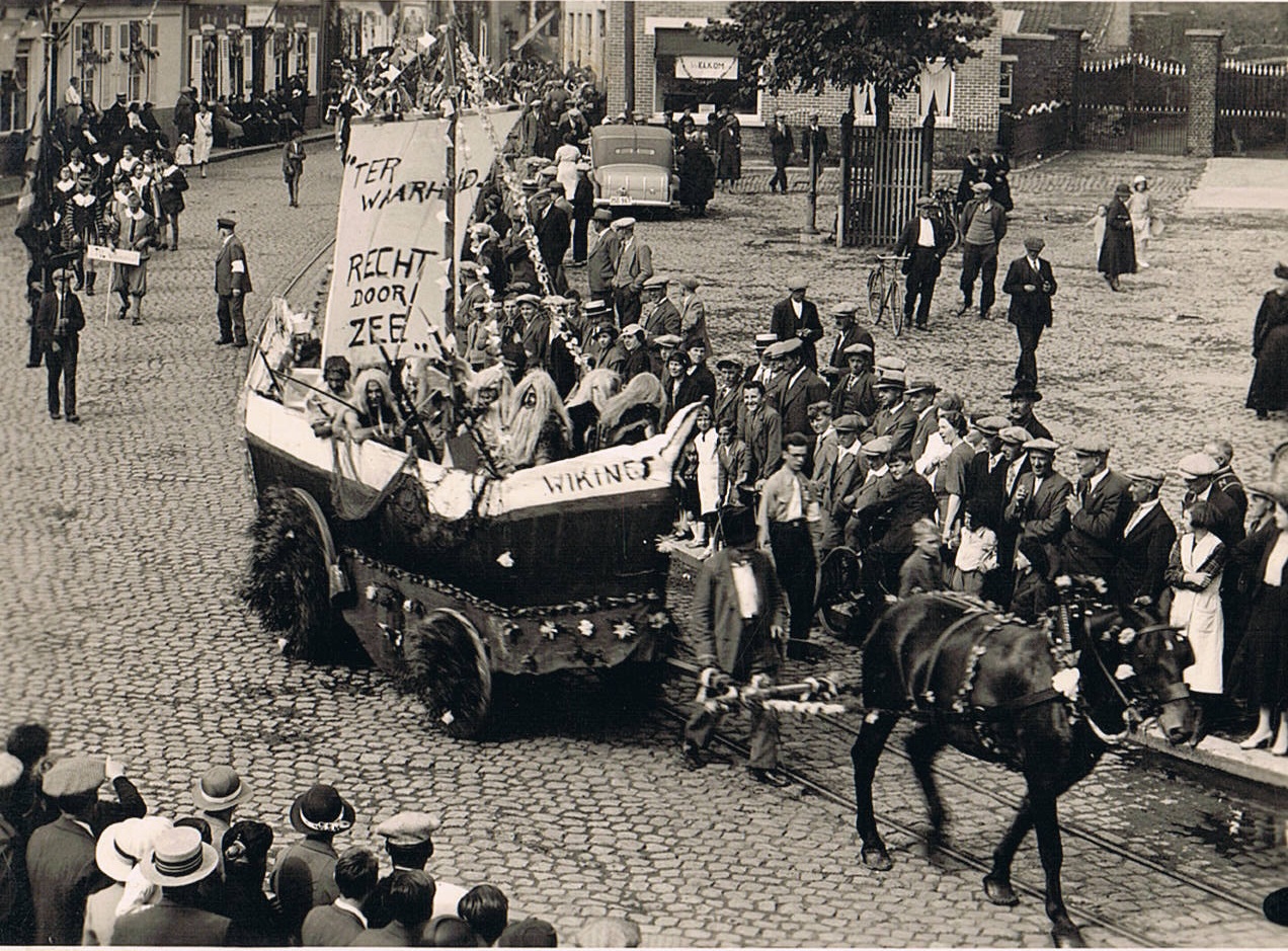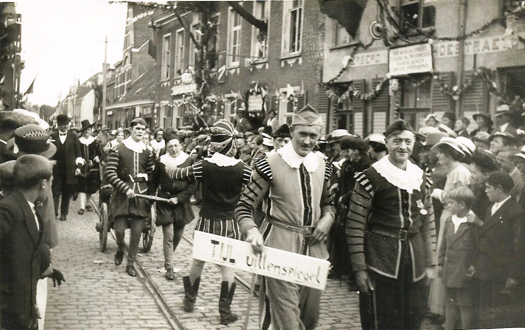 De Strijdbroeders in de optocht, een groep met de “Knesselaarse” Tijl Uilenspiegel als thema. We herkennen onder meer Victor Crappé, Emiel Speeckaert, Jozef Van Hooreweghe en Maurits Cooreman