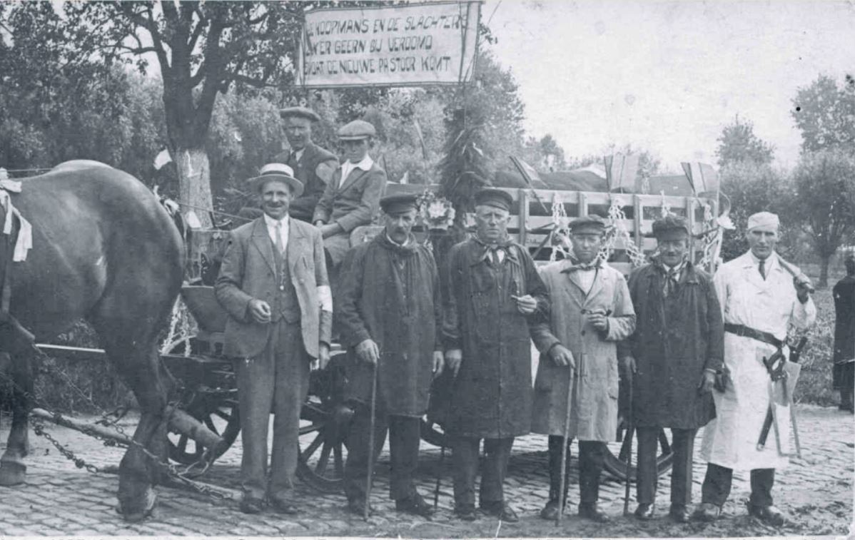 De koopmans en slachters trekken mee in de stoet: René Dedecker, Victor Wittevrongel, Victor De Wispelaere, Phillemon Vermeire, Aloïs Van Kerrebreock en slager Alfons De Rijcke, voerman Camiel Martlé en naast hem Maurits Standaert. “De koopmans en de slachter, zijn er geern bij verdomd, omdat de nieuwe pastoor komt. (Foto’s Hooft/ Gerard VdC, Knesselaars Nieuws, JuGo)