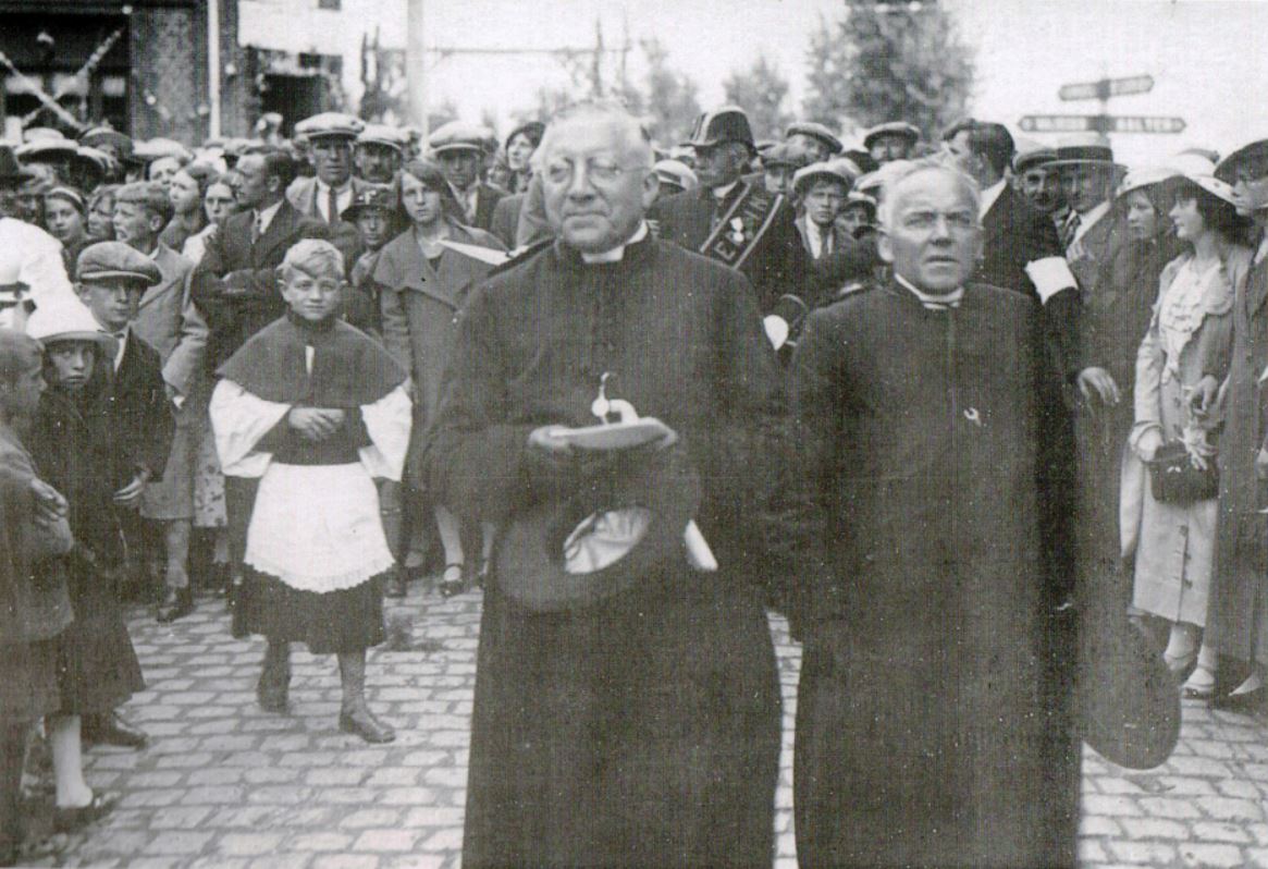 De fiere pastoor en zijn luitenant onderpastoor Hendrik De Sutter, omringd door misdienaars (André Van Hooreweghe in beeld), de Suisse (Adolf Raes), muzikanten en veel volk, op stap door de Veldstraat, richting kerk.