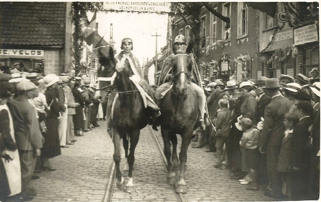 De Strijdbroeders in de optocht, een groep met de “Knesselaarse” Tijl Uilenspiegel als thema. We herkennen onder meer Victor Crappé, Emiel Speeckaert, Jozef Van Hooreweghe en Maurits Cooreman