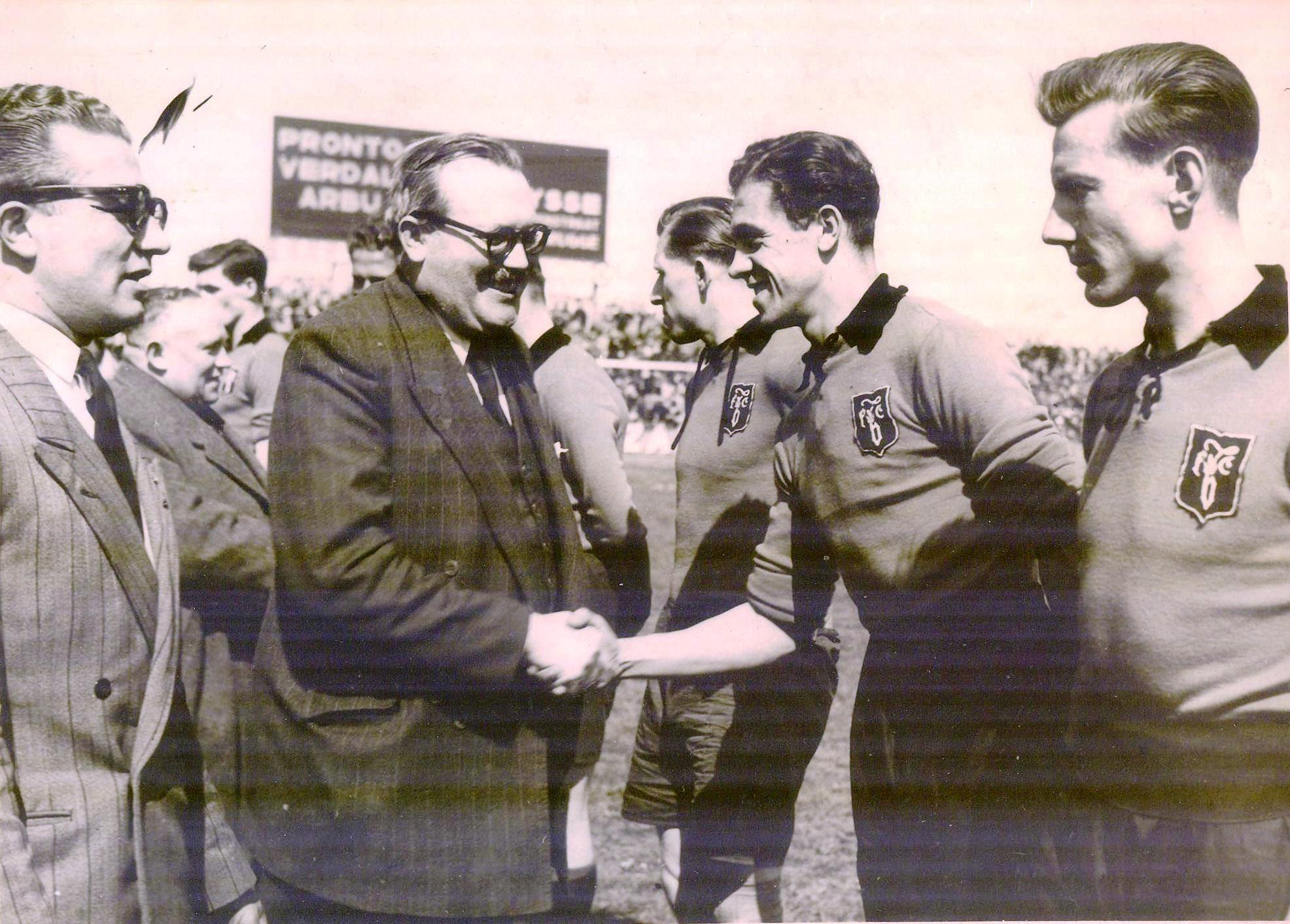 De spelers van Club Brugge worden begroet door de Brugse burgemeester en minister Achille Van Acker. Edgard Van de Casteele helemaal vooraan rechts