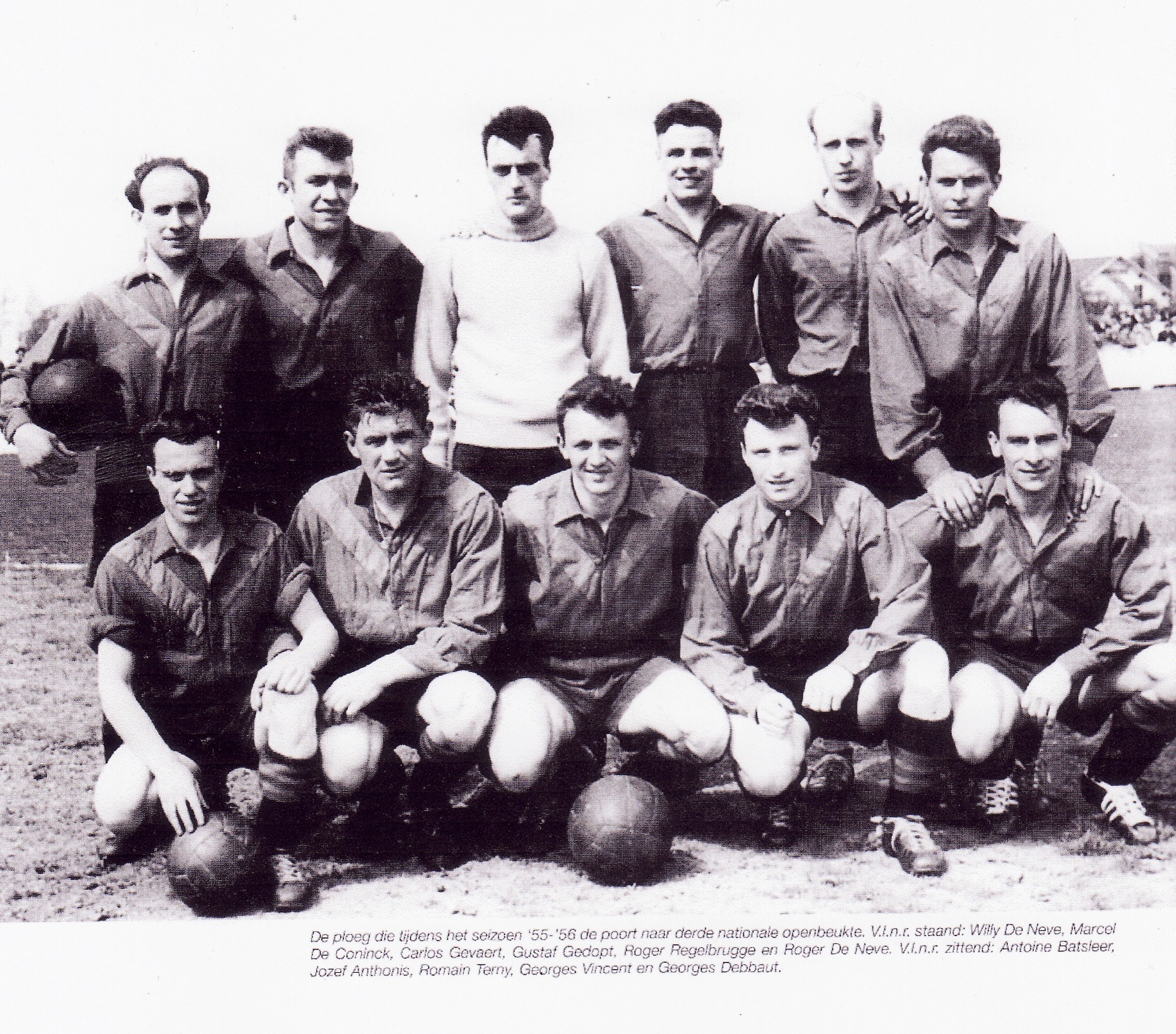 Laat ons beginnen met de gebroeders Roger en Willy De Neve. Beiden hebben in derde klasse bij FC Eeklo gespeeld. Roger werd ontdekt bij de ploeg van de normaalschool. Er volgden tests bij meerdere ploegen, maar het was den FéCé die er mee aan de haal ging. Aanvankelijk speelde Roger als midvoor, maar geleidelijk werd hij de strateeg van de ploeg: een hardwerkende, klaarziende middenvelder. Zijn lange loopbaan bij Eeklo is duidelijk het bewijs van zijn nuttigheid voor de ploeg. Hij speelde in de fanionploeg van 1949 tot 1961! En hij maakte de opmars mee van tweede provinciale naar derde klasse.