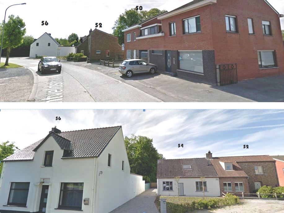 Links op beide foto’s, het witte huis achteraan: locatie geweest van Café Den Heerd (nr 56 Rita De Pauw, 1981-1991, nadien nog andere uitbaters). Huis nr. 54: locatie van Café Eentveld van Anna Bruggeman en Albert Bleyaert, 1958-1970. Locatie hoekhuis vooraan, nr. 48: de prille Ronbarbo van Andrea, later verhuisd, of toen nog geen officiële herberg? (1975-1978).
