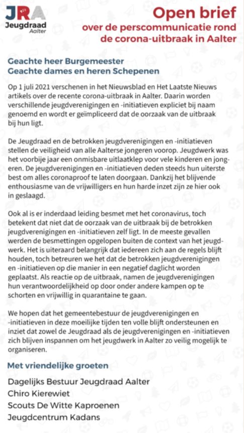 Toch kwam er protest van een aantal jongeren van de Aalterse Jeugdraad. In een Open brief aan de burgemeester stelt het dagelijks bestuur van de raad dat de berichtgeving zou impliceren dat de uitbraak de schuld van de genoemde verenigingen zou zijn. Dat de “leiding” besmet geraakte, betekent niet dat de “oorzaak” van de uitbraak bij de betrokkenen ligt, en “in de meeste gevallen werden de besmettingen opgelopen buiten de context van het jeugdwerk”, schrijven ze. Waar dat dan mogelijks wel is gebeurd wordt niet vermeld.
