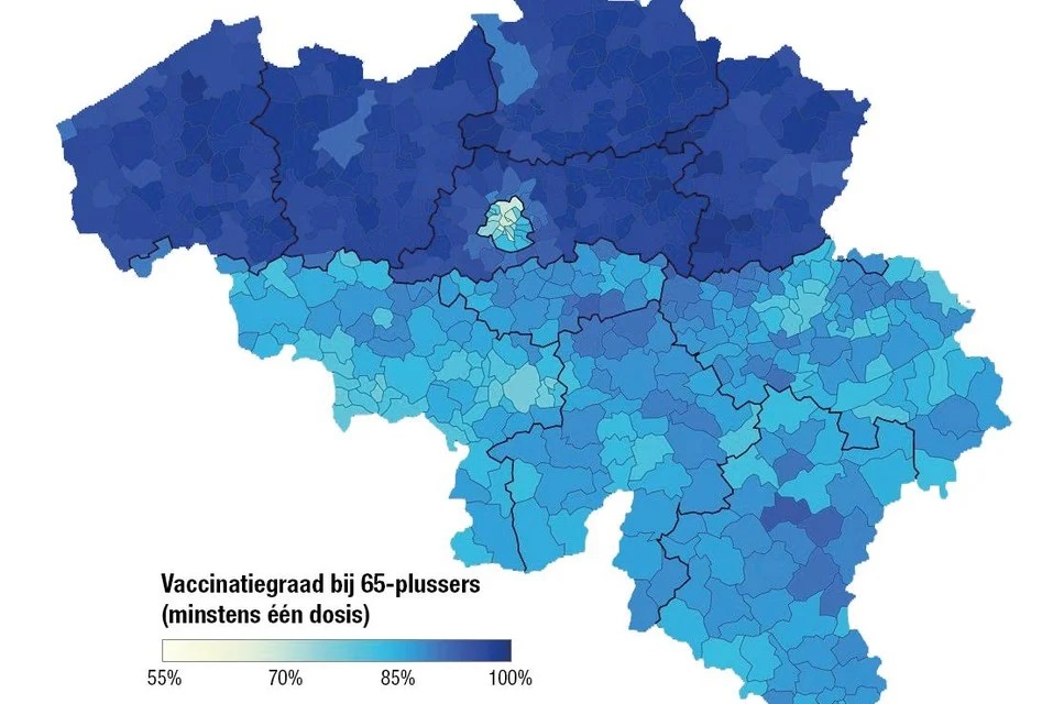 Met een vaccinatiegraad van 88 procent in Vlaanderen (eerste prik) is onze regio merkelijk beter bezig dan Wallonië (76) en Brussel (59).