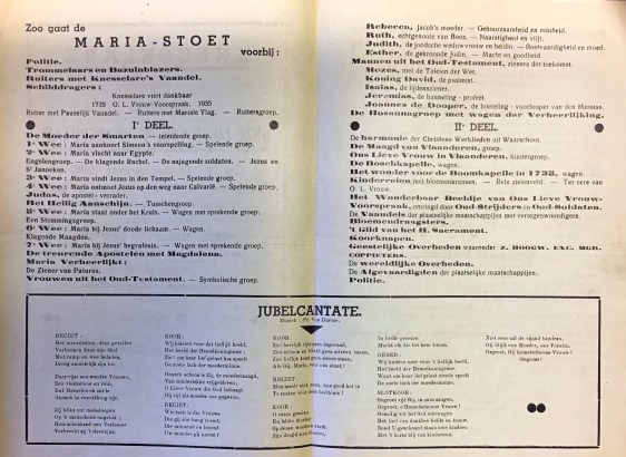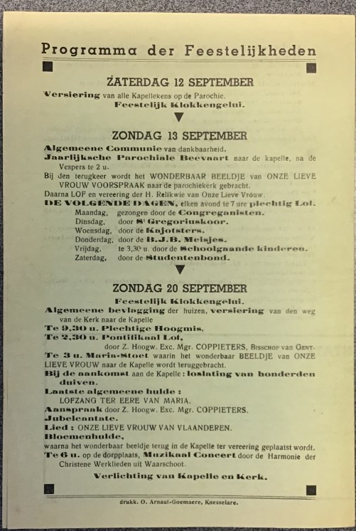 Deze reeks gaat over stoeten, niet over processies. Maar dit evenement, met een bijzonder uitgebreid programma (zie afbeelding) en een ferm uit de christelijke kluiten gewassen optocht naar de kapel, werd door de organisatoren geen processie, maar een “stoet” genoemd. Een Maria-stoet die ons informeert over de rijke Vlaamse (en ook Knesselaarse) stoetentraditie. De jaren 1930 waren zo mogelijk nog katholieker gekleurd dan de voorafgaande decennia.
