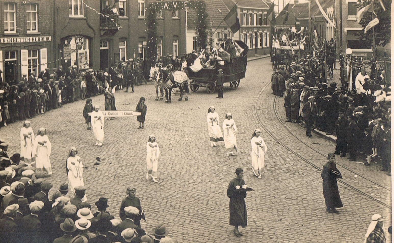 Opnieuw een beeldenpakketje over een van de grootste Knesselaarse stoeten. In dit geval de toch wel tot de verbeelding sprekende Maria-Stoet die in 1936 werd georganiseerd richting onze Grote Kapel (Dries). De Kerk “straalde” in die tijd haar macht uit.