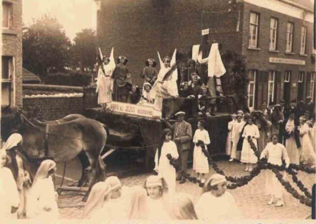 De wagens vormen een stoet in de Kloosterstraat. Hier ter hoogte van de woning Van den Kerchove (toen ook nog herberg, Hof van Commerce)
