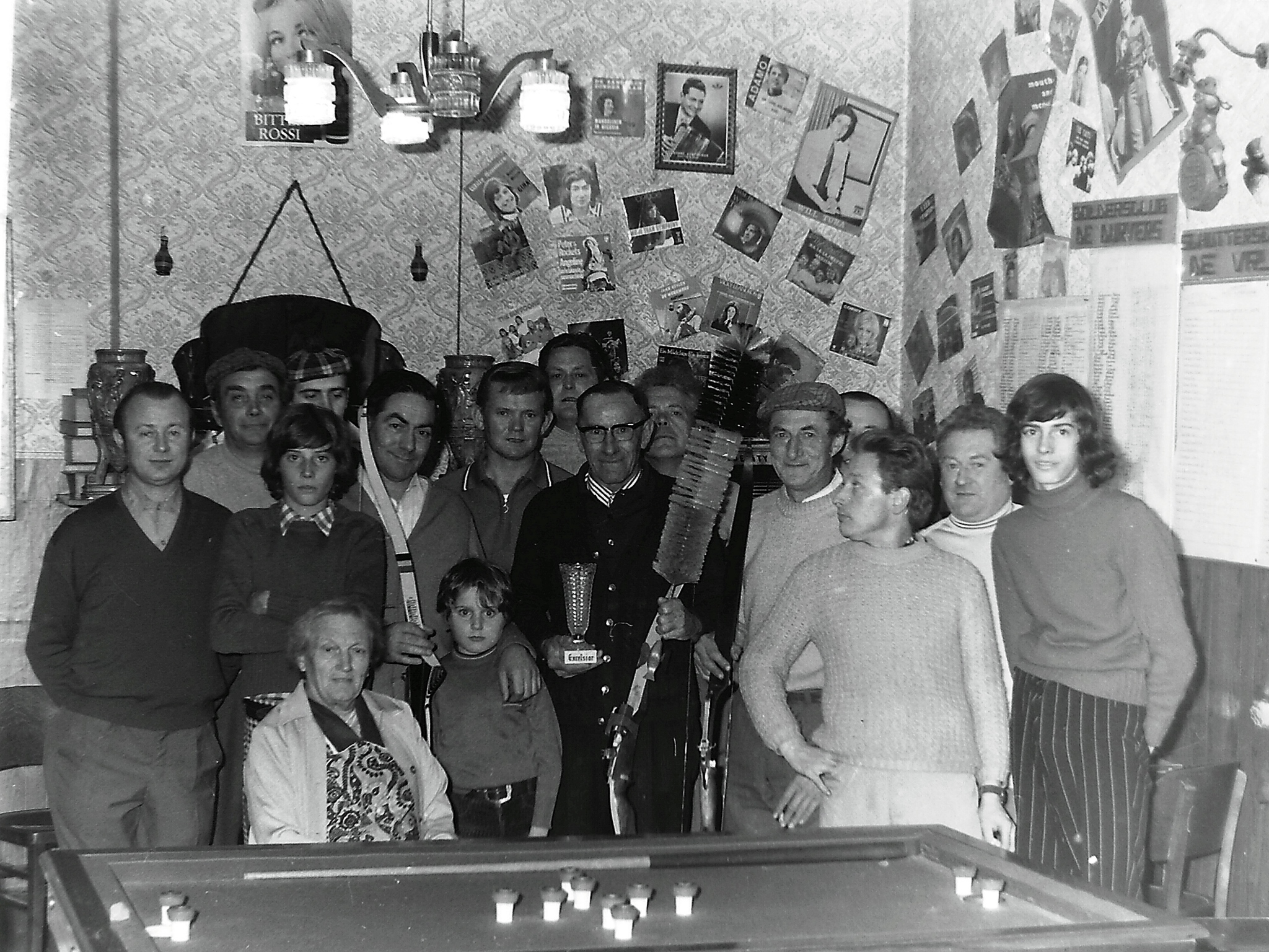 De Café ‘In de rust der wandelaars’ bij de familie Mouton, langs Sint-Joris-kalseide. Binnenin kon het er gezellig zijn. Als haringen in een ton rond de koffietafel bij het jaarlijks feest van de spaarders. (Foto’s Vanthuyne/Hooft). We herkennen hier onder meer Maria Goemaere (links achteraan), Remi Wille en Jozef Gyselbrecht (vooraan midden en rechts), Oscar De Vlieger en Rita Mouton (midden/midden) Remi Vyncke en zijn vrouw (midden achteraan), bier- en kolenhandelaar Jozef Almey en zijn vrouw Mariette Dhondt (rechts achteraan) Rolanda Mouton (midden rechts) en Georges Carette (helemaal rechts) en zijn vrouw Marcella Van Hulle