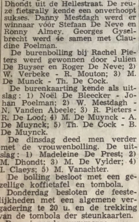 Het is een beetje ongebruikelijk geworden, maar kranten maakten vroeger nog gewillig plaats voor de uitslagen van sport en spel en deelden het caféleven graag aan de wereld mee. Een knipsel uit Het Volk verraadt wie er in de Helle en aanpalende straten naar de kermis trok om er zich te vermaken met sport en spel. Zelfs de fanfare stapte toen al eens op vrijdag op Helletocht. Begeleid door fakkellicht. “Een kermis die al eens duurde van vrijdagavond tot dinsdagavond”, vertelt Luc Neirynck.