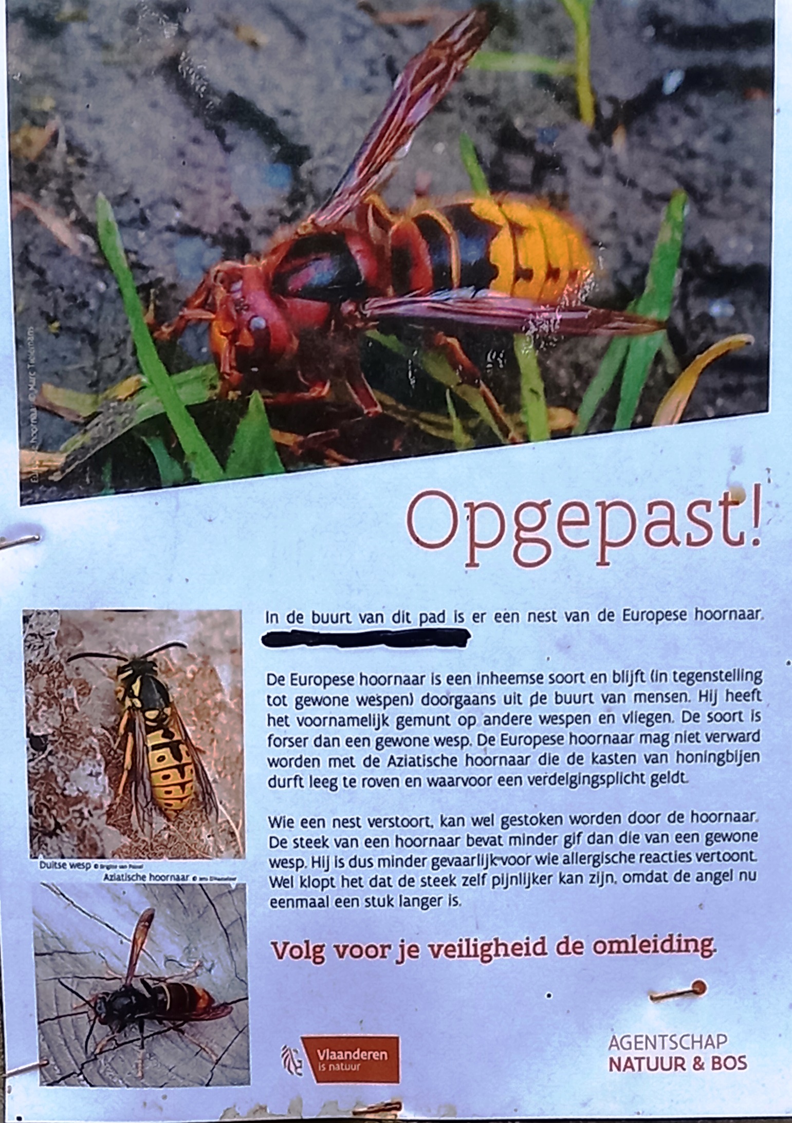 Hierboven de tekst die ANB aanbracht op twee borden in de buurt van die locatie. “De sympathieke loebassen zijn niet opvallend agressief naar mensen toe,” lezen we. “Wie een nest van hoornaars ontdekt, kan die gerust laten zitten”. Bevindt het nest zich toch te dicht bij een huis, doe dan best een beroep op de brandweer”. Prima dit te weten. Maar wat is het verschil tussen “dicht bij een huis” en “dicht bij de wandelaar, de jogger of het spelend kind“?