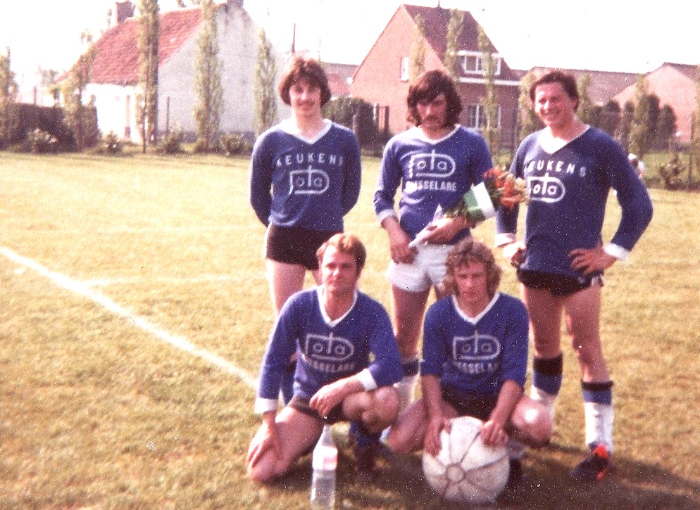 De pioniers: Jean De Loof, Freddy De Loof, Gilbert De Neve, André Dierickx. Zittend op de bal: Antoine De Dobbelaere