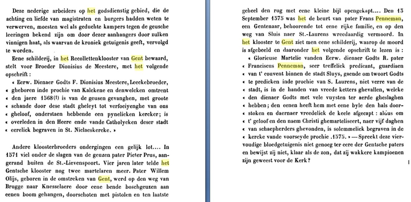 Het gaat over de “Glorieuse Martelie van Eerw. dienaer Godts R. Pater Guillelmus Olijs / Martelaer gheboren bij Ghendt, van Brugghe commende binnen de Prochie knesselaere, vreede ketters sprijnghende wt den Bosch, hebben den dienaer Godts aen eenen Boom ghehanghen, met vele Pistolescheuten doorschoten en siende dat hij noch leefde, hebben hem/met dit bijlken (hierboven henghend tot memorie van auts bewaert) van Hoofde tot beneden den rugghe vreedelick doorcapt.. Wiens lichaem van catholike tot aen t Hospitael bij de Bruchsche poort Ghebracht is daernaer met groote solemniteijt van sijne Medebroeders religieusen vergheselschapt van goede inwonders en clergi van Ghendt in dit clooster neffens R.P. Petrus Prus Begraeven, is Ghemarteliseert/ anno 1575